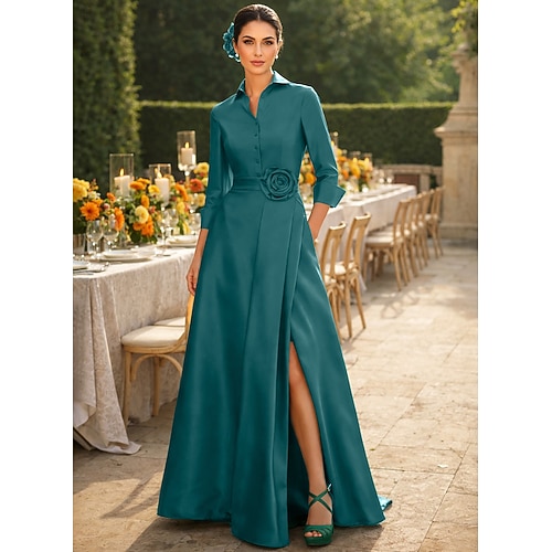 Linea ad A Lunghezza al pavimento Abito Camicia Abito da invitata a nozze Abito Formale Abito da cerimonia per signora Manica 3/4 Colletto a Camicia Elegante Matrimonio Formale Taffetà Raso
