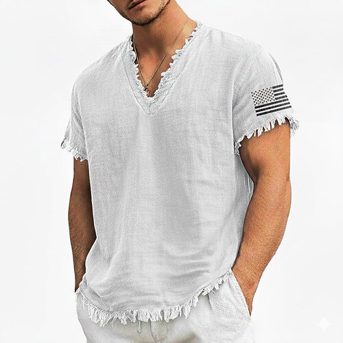 Herren-T-Shirt mit Ananas-Print aus Leinen-Baumwoll-Mischgewebe, V-Ausschnitt, offene Kanten, olivgrün, sommerliches tropisches Strandurlaubs-Shirt, ausgefranstes, weiches Modetop, Größen S-3XL