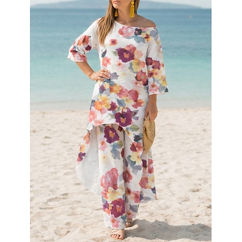 Per donna Set da due pezzi Set di Pantaloni Bolero Top Manica Lunga Girocollo Senza Spalle Floreale Grafico Vacanza Moda Streetwear Casuale Quotidiano Spiaggia Bianco Rosa Blu Reale Estate