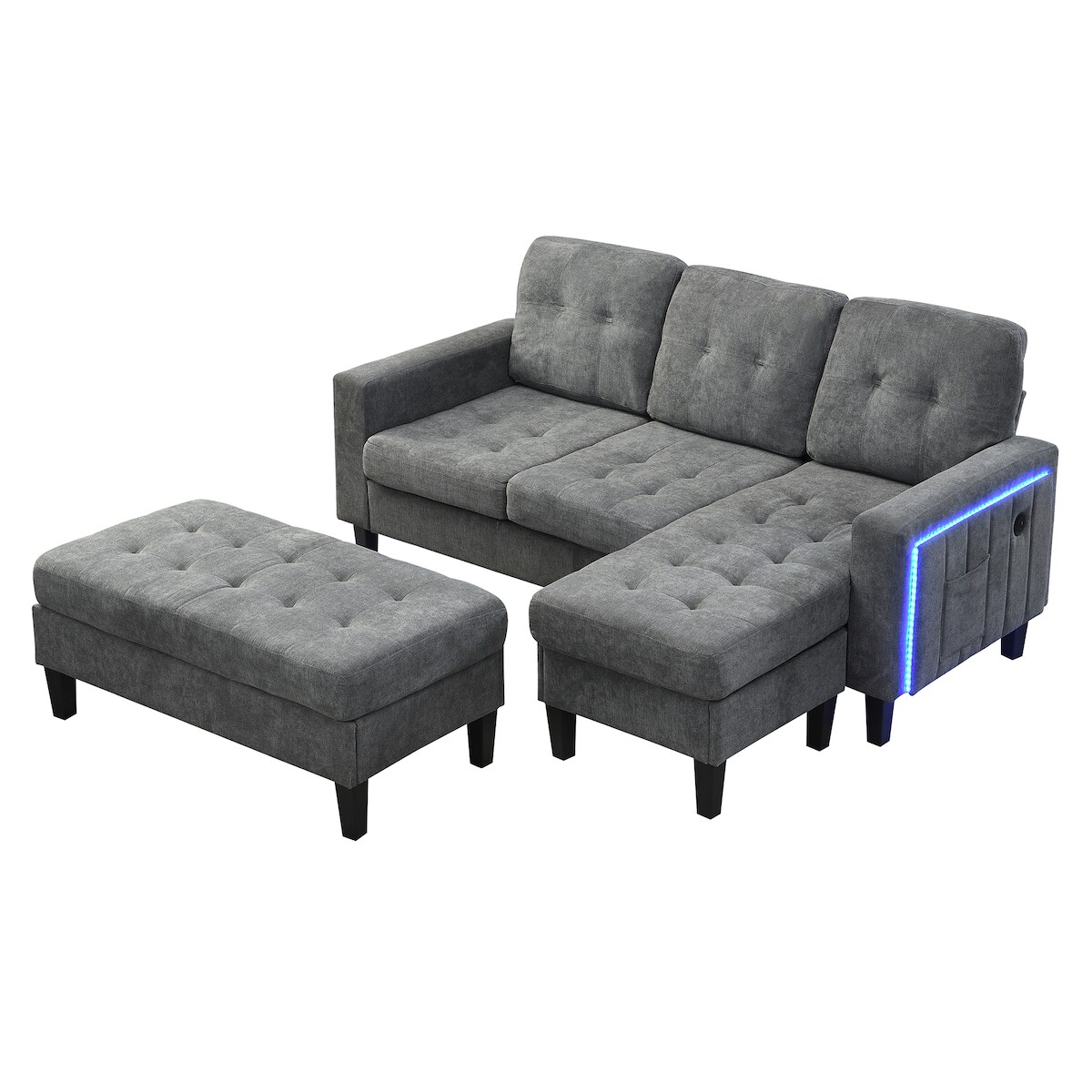 OKWISH Multifunktionales L-Form Sofa mit Hocker, LED-Beleuchtung, USB-Anschluss, Chenille-Stoff, 500 kg belastbar, Gesamtgröße 185x135x85 cm, Grau