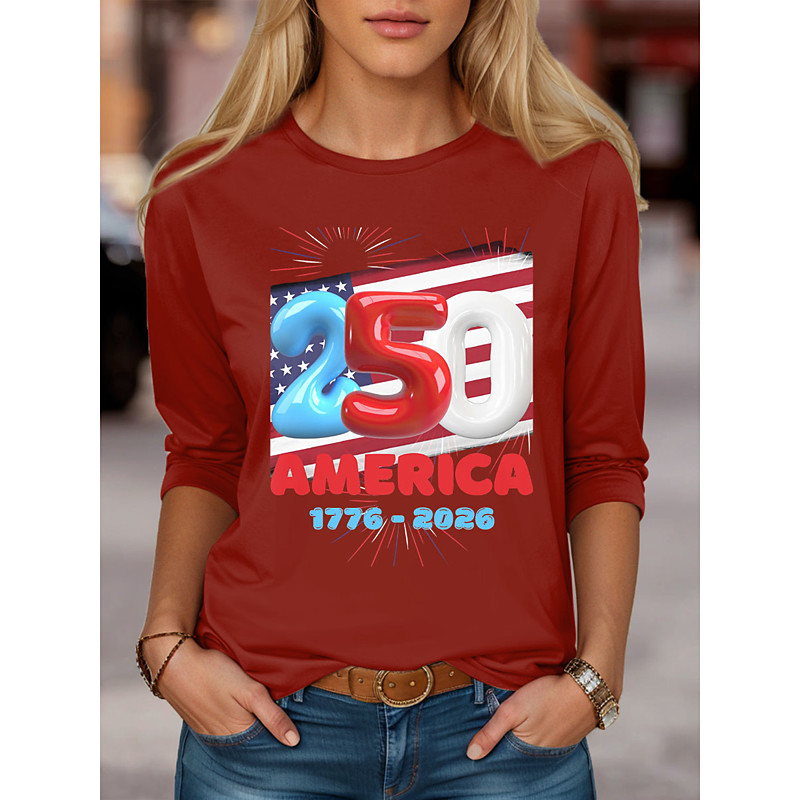 American 250th Women's Independence Day T Shirt Graphic USA Flag Fashion Stylish Classic Long Sleeve Crew Neck Round Neck Regular Tops Daily Weekend Print Blue Black White Red Summer Spring Fall