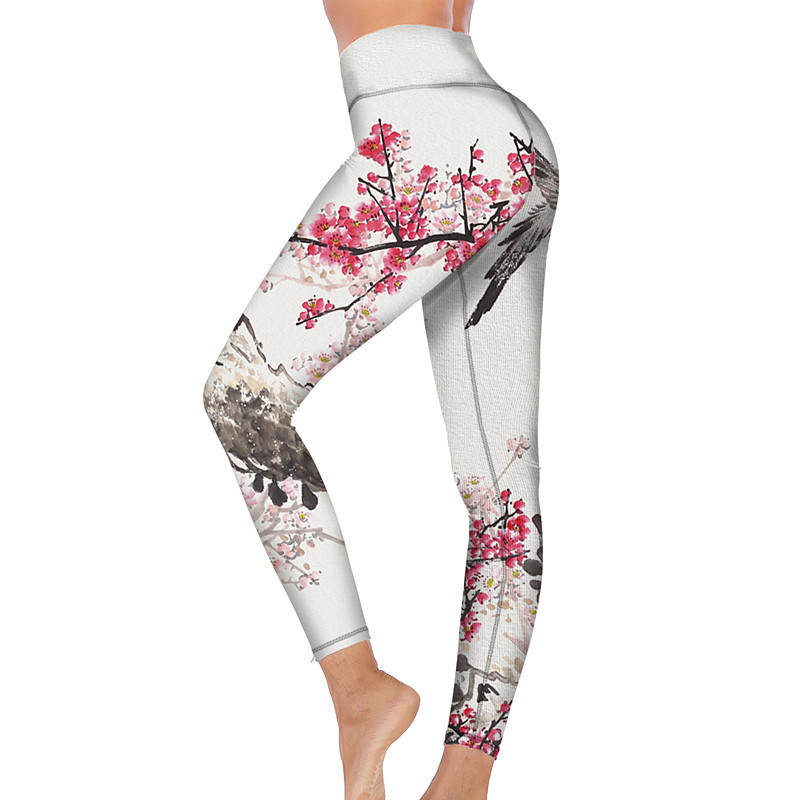 Women's Yoga Pants Butt Lift Tummy Control High Waist Gym Workout Running Fitness Tights Leggings Bird Floral White Fall Winter Sports Activewear High Elasticity