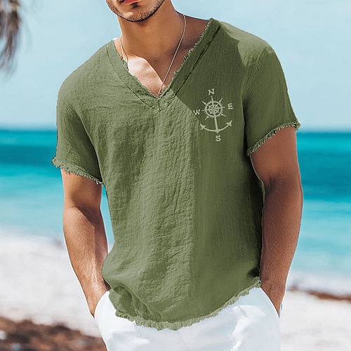 Herren-T-Shirt mit nautischem Kompass- und Ankerprint aus Leinen-Baumwoll-Mischgewebe, V-Ausschnitt, offene Kanten, atmungsaktives, weiches Designer-Top für Sommerurlaub und Strandurlaub, Größen S-3XL