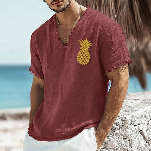 Herren-T-Shirt mit Ananas-Print aus Leinen-Baumwoll-Mischgewebe, V-Ausschnitt, offene Kanten, olivgrün, sommerliches tropisches Strandurlaubs-Shirt, ausgefranstes, weiches Modetop, Größen S-3XL