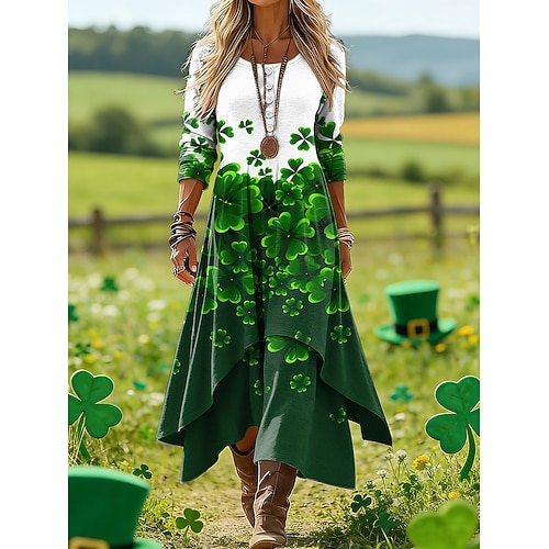 Vestito midi da donna per la festa di San Patrizio, casual, quotidiano, festivo, vestibilità regolare, con motivo grafico a trifoglio, manica lunga, girocollo, bianco, verde, estate, primavera.