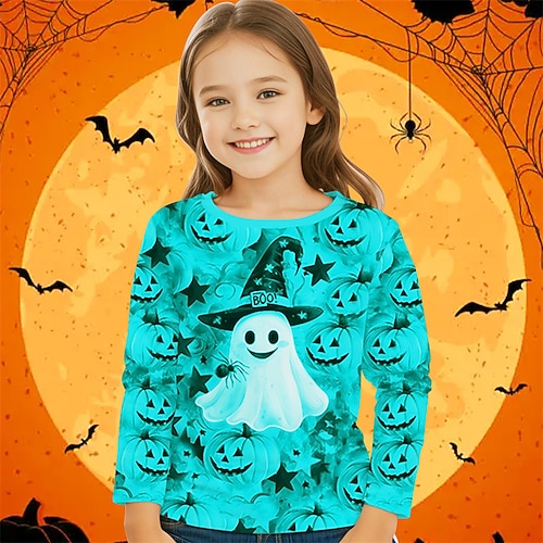 Halloween Mädchen 3D Kürbis Geist T-Shirt Langarm Frühling Herbst Mode Basic Kinder 4-12 Jahre Rundhalsausschnitt Outdoor Lässig Täglich Normale Passform