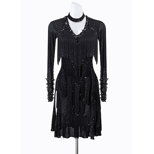 abito da ballo latino da donna con frange di perline nere - costume da ballo asimmetrico a maniche lunghe con scollo a girocollo