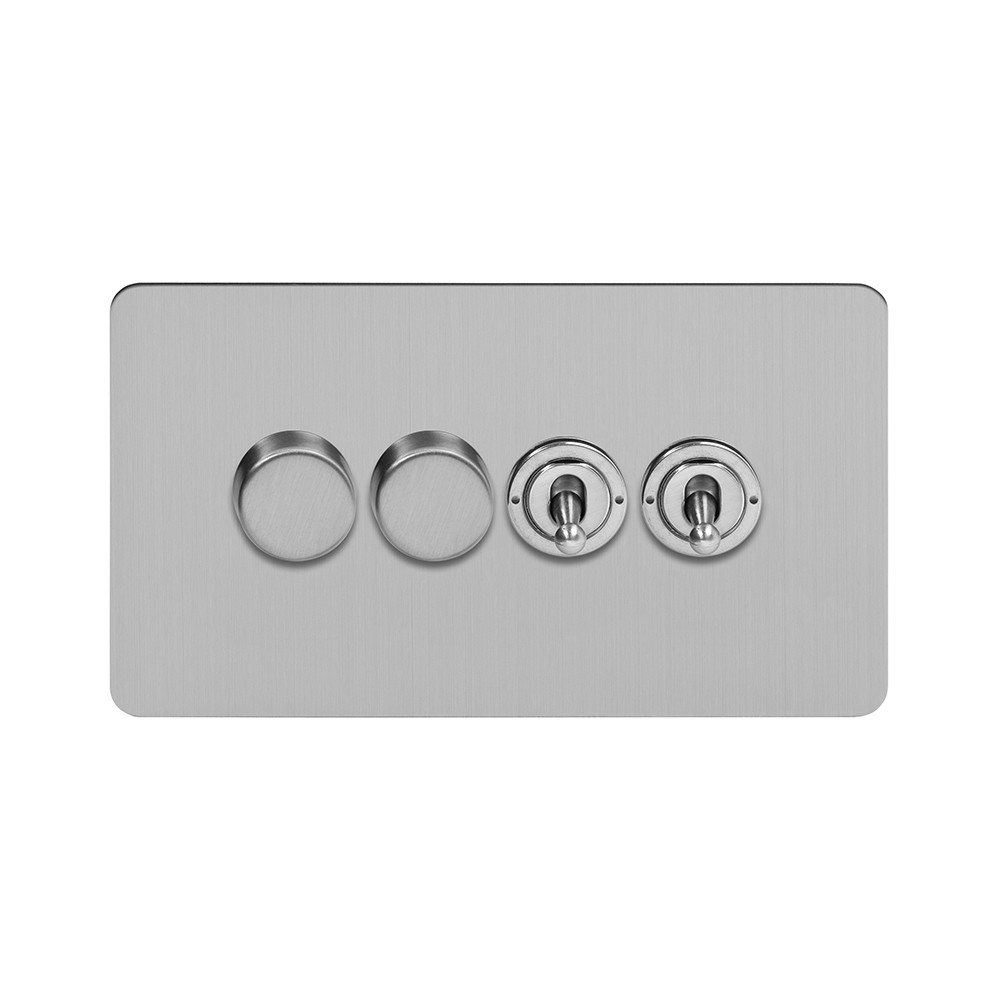 Soho Lighting Brushed Chrome Flat Plate 4 Gang Switch with 2 Dimmers (2x150W LED Dimmer 2x20A 2 Way Toggle)