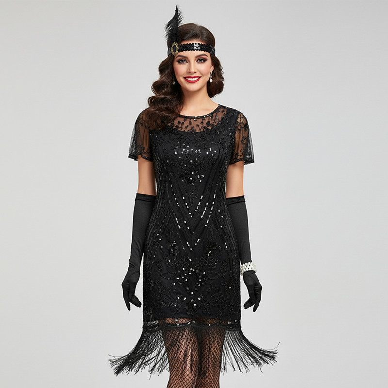 Retro Vintage Roaring 20s 1920s Knee Length Flapper Dress Outfits Accessories Set Short Sleeves The Great Gatsby Wedding Guest Sequins Tassel Fringe Sequin Tassel V Neck Fancy Dress Women's Carnival