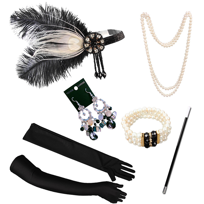 Set Roaring 20s 1920s Cocktail Dress Knee Length Flapper Dress Dress Outfits with Accessories Short Sleeves The Great Gatsby Charleston Sequins Tassel Fringe Feather V Neck Fancy Dress Women's