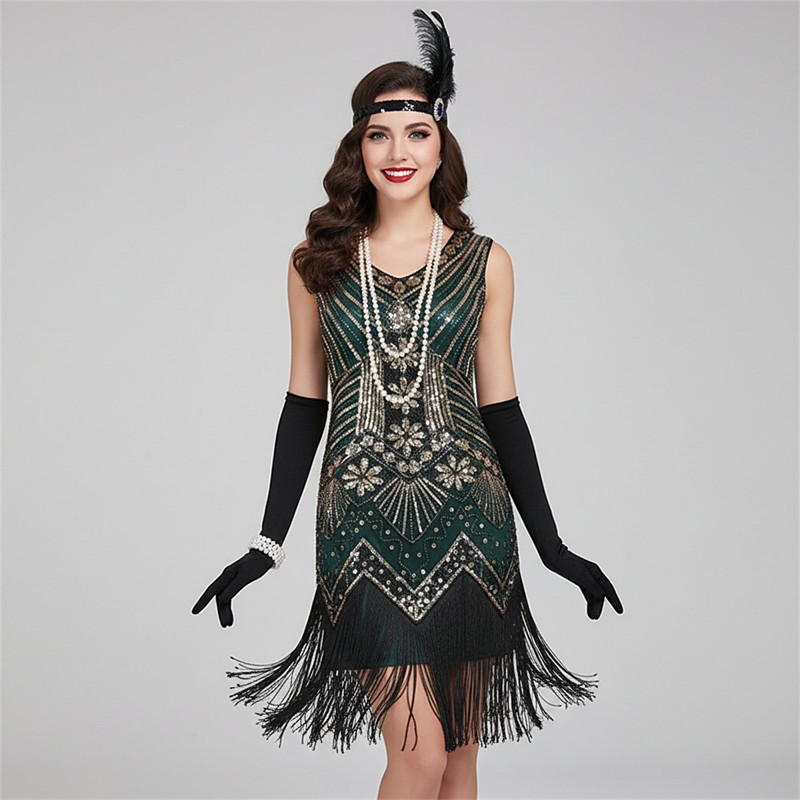 Set Roaring 20s 1920s Cocktail Dress Mini Flapper Dress Dress Outfits with Accessories Sleeveless The Great Gatsby Charleston Sequins Tassel Fringe Feather Deep V Fancy Dress Women's Carnival New