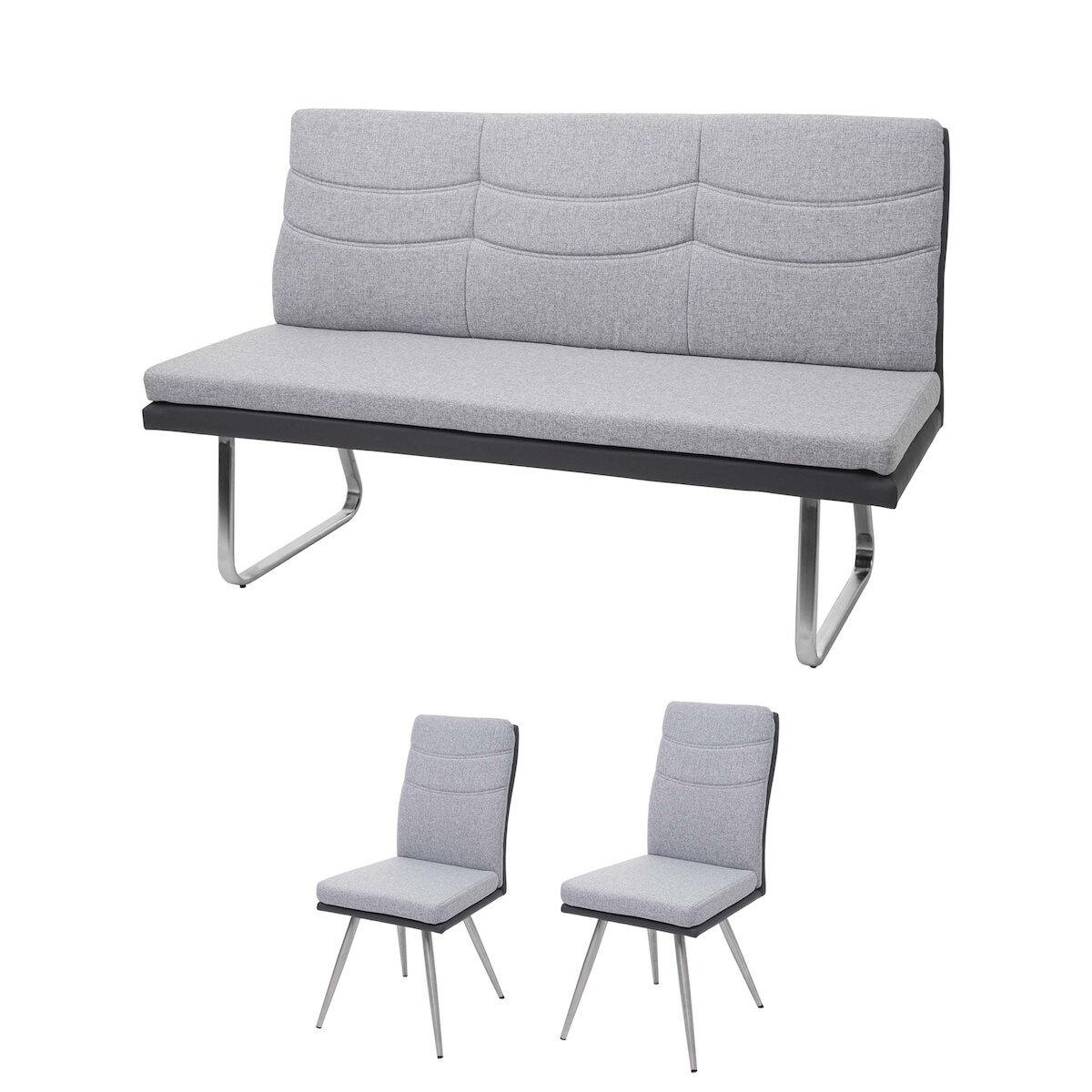 Mendler Set 2x Esszimmerstuhl+Sitzbank HWC-G54, Bank Küchenstuhl Stuhl, Stoff/Kunstleder Edelstahl ~ grau Bank 180cm