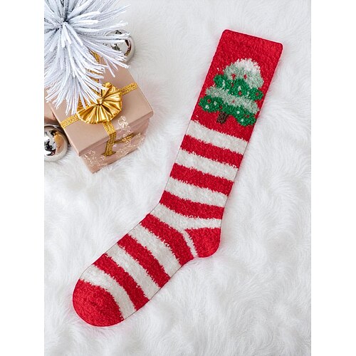 Calzini natalizi lunghi fino al ginocchio da donna, caldi e comodi calzini invernali per la casa con motivo a stelle rosse e verdi festive per rilassarsi durante le vacanze regali