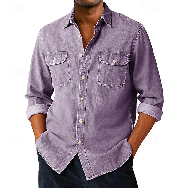 Men's Shirt Casual Shirt Button Up Shirt Cargo Shirt Acid Wash Shirt Blue Black White Purple Green Long Sleeve Plain Lapel Daily Outdoor Clothing Apparel Fashion Modern Casual Comfortable