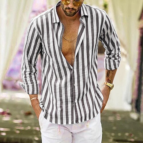 Herren Hemd Leinenhemd Sommerhemd Freizeithemd Strandhemd Knopfhemd Gestreift Urlaub Ferien Schwarz Gelb Rosa Rot Langarm Umlegekragen Frühling Herbst Bekleidung Button-Down