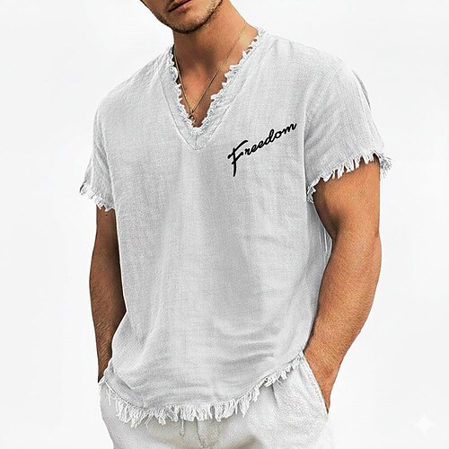 Herren-T-Shirt mit V-Ausschnitt, bedruckt mit Freedom-Schriftzug, aus Leinen-Baumwoll-Mischgewebe, offene Kanten, olivgrün, sommerliches, lässiges Strand-T-Shirt mit Fransen, weiches Mode-Top, Größen