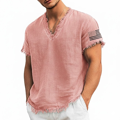 Herren-T-Shirt mit amerikanischer Flagge am Ärmel, bedruckt aus Leinen-Baumwoll-Mischgewebe, V-Ausschnitt, offene Kanten, patriotisches Sommer-Strand-Shirt mit USA-Motiv, ausgefranst, weich, modisches