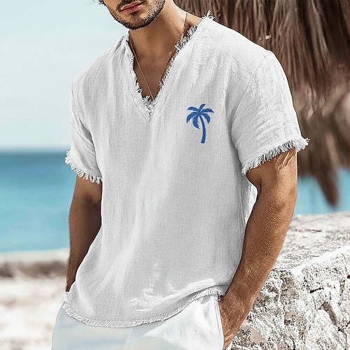 Herren-T-Shirt mit kleinem Palmenprint aus Leinen-Baumwoll-Mischgewebe, V-Ausschnitt, offene Kanten, altrosa, sommerliches Strandurlaubs-Shirt mit Fransen, weiches Designer-Top, Größen S-3XL