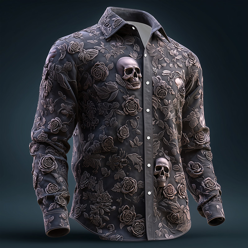 Men's Skull Floral Print Day of the Dead Shirt Button Up Shirt Long Sleeve Vintage Retro Dark Gothic Style Outdoor Holiday Spring Fall Turndown 3D Print Linen Like Shirt Black Dark Blue