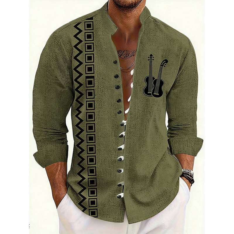 Men's Geometric Pattern Guitar Musical Instrument Shirt Stand Collar Shirt Long Sleeve Vintage Retro Casual Vacation Spring Fall Mandarin Collar Band Collar Button-Down Linen Like Shirt Blue Orange