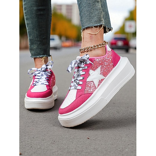 Sneakers da donna con plateau e stelle glitterate - scarpe casual stringate rosse e bianche con dettagli in paillettes scintillanti per street style e viaggi festival