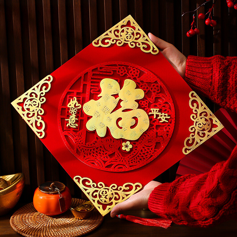 1pc 13.7in 3D Chinese New Year Self-Adhesive Fu Ornament,2026 Spring Festival Fu Velvet Stickers, Year of The Horse Lunar New Year Decorations for Home Door Window Cabinet Ru Yi Ping An