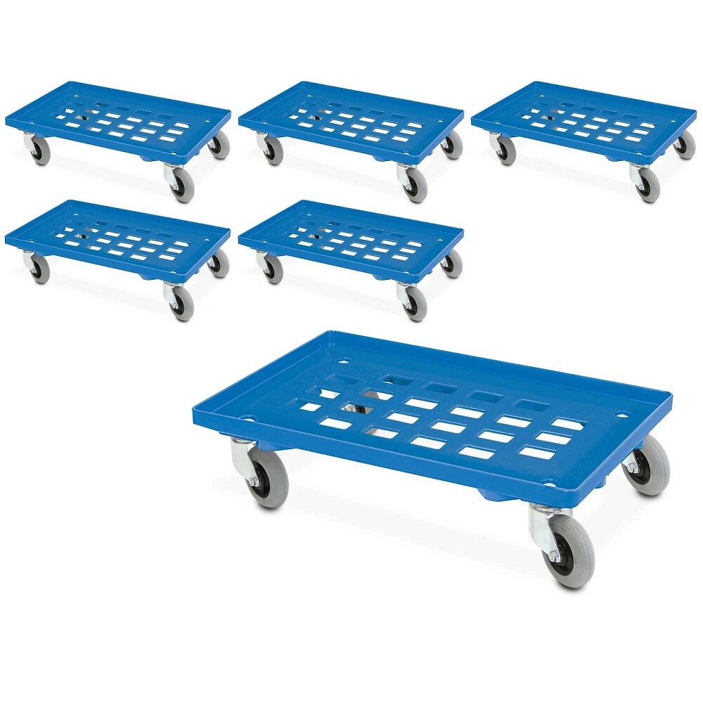 BRB 6x Transportroller mit Flüsterrollen, blau, Gitterdeck, für Behälter 600x400 mm oder 2x 400x300 mm