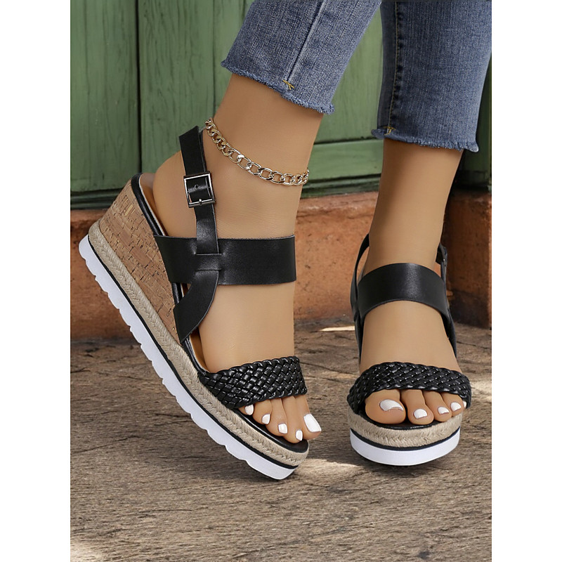 Women's Black Wedge Sandals with Cork Platform, Braided Strap and Adjustable Buckle for Casual Summer Outings
