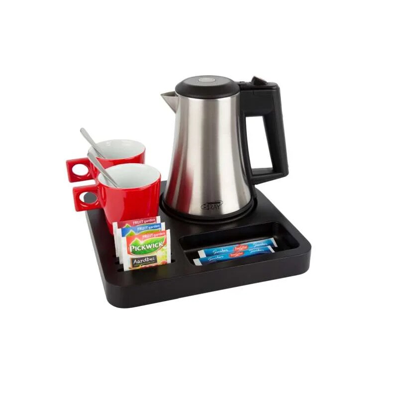 Willkommenstablett SLIM Schwarz mit Wasserkocher STAR 0,5 L Edelstahl und 2 rote Porzellantassen