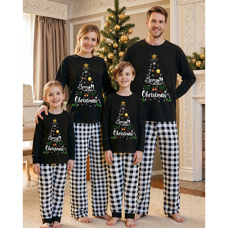 Family Christmas Christmas Family Pajamas Pajamas Family Sets Graphic Plaid Christmas Tree Home Print Black Long Sleeve Daily Matching Outfits