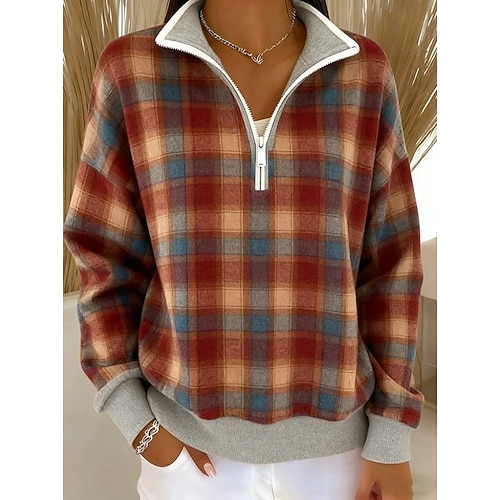 Per donna Felpa Pullover Plaid Casual Manica Lunga Mezza zip Top Regolari Abbigliamento Quotidiano Casuale Sportivo Marrone Autunno