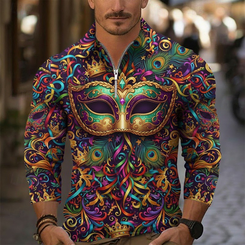 Men's Polo Polo Shirts Daily Carnival Lapel Long Sleeve Fashion Hawaiian Graphic Mask Printing Quarter Zip Spring Fall Tailored Fit Deep Purple Light Purple Purple Dark Purple Polo