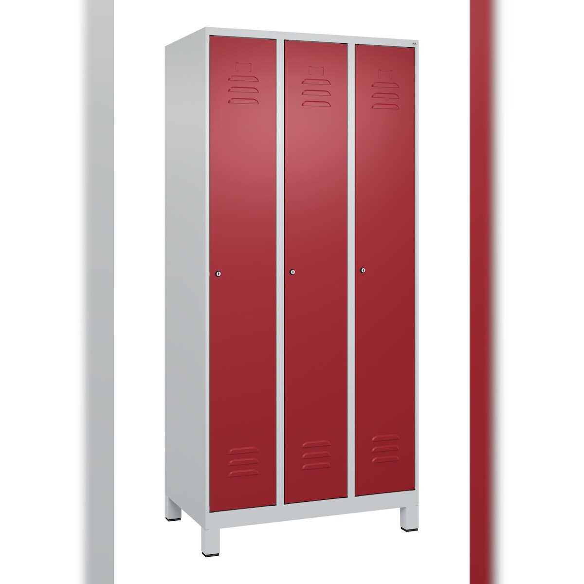 C+P Spind Classic PLUS, Füßen, 3 Abteile, HxBxT 195x90x50cm, Zylinderschloss, Hellgrau/Rubinrot von PROREGAL