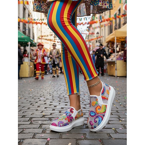 mocassini da donna con plateau ricamati con motivo paisley bianco colorato: vivaci calzature festive per eventi di carnevale, festival di strada, feste a tema e riunioni informali durante le festività