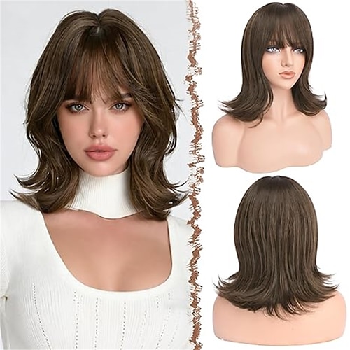 Schulterlange Bob-Perücke mit Pony für Damen – braun-honigblond gemischte, natürlich gestufte, gewellte Kunsthaarperücke, 14 Zoll, für den täglichen Gebrauch, Partys und Kostüme.