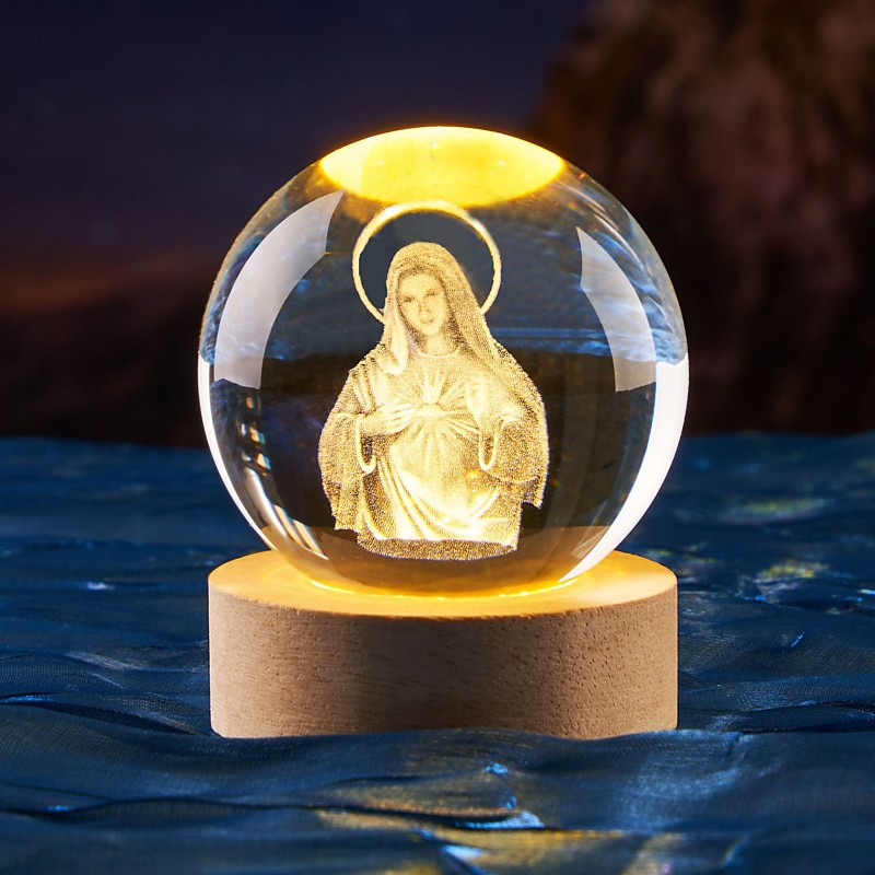 3D Crystal Virgin Mary Statue Figurine with Wooden Base, Laser Etched Crystal Our Lady of Guadalupe Glass Sphere Statue, 3D Crystal Ball Mother Mary Christian Catholic Religious Easter Gifts
