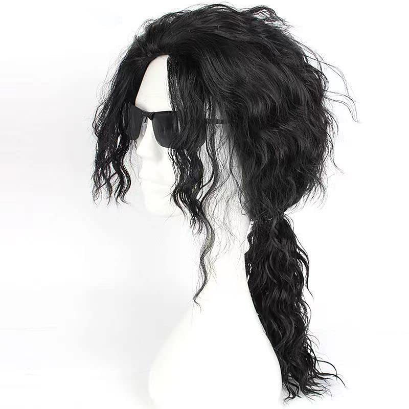 Super Star Imitation Cosplay Wigs for Men in the Heat Resistant Long Natural Black Curly Synthetic Ponytail Wigs Character Wig for The Imitator to Cherish and in Memory Halloween Wigs
