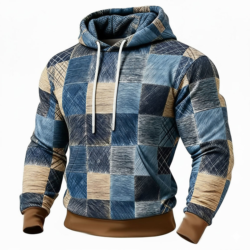 Men's Geometric Plaid Hoodie Sweatshirt Fashion Daily Crew Neck Home Streetwear Party Blue Purple Brown Gray Drawstring Fall Winter Designer S M L XL XXL XXXL