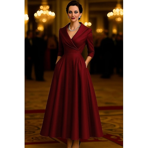 Linea ad A Lunghezza alla caviglia Vestito da Festa Abito da Cocktail Abito da invitata a nozze Abito da cerimonia per signora Manica 3/4 Scollo a V Colletto a Camicia Elegante Vintage Formale Raso