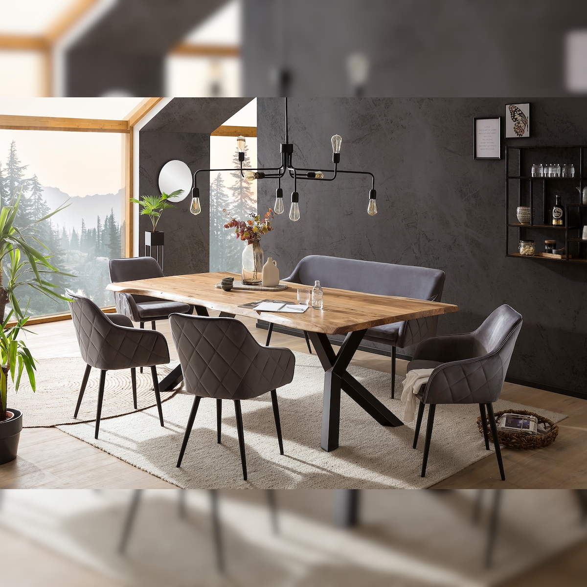 SalesFever 6-tlg. Akazie-Essgruppe 240x110 cm | Platte 35 mm Akazie | Metallgestelle | 4 Stühle & 1 Bank in Samt-Optik | natur – schwarz – grau
