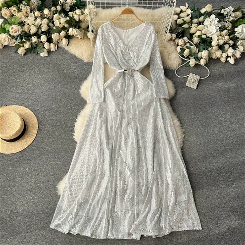 Women's Midi Dress Sequin Dress Elegant Fashion Modern Daily Outdoor Beach Regular Fit Plain Long Sleeve V Neck Blue Black White Yellow Spring Autumn