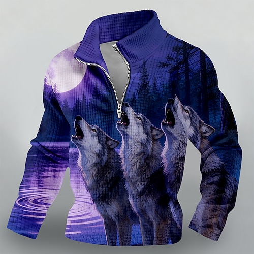 Per uomo Lupo Nido d'ape Felpa Moda Quotidiano Da caccia Collo alla coreana Zip a un quarto All'aperto Abbigliamento casual alla moda Viaggio Campeggio Blu Viola Blu scuro Con zip Autunno Inverno
