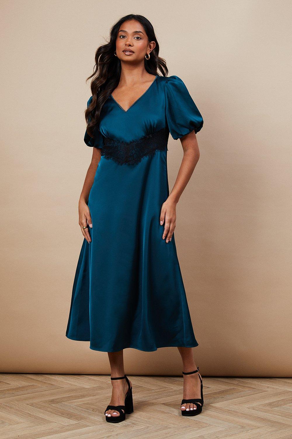 Oasis Womens Occasion Satin Lace Waist Midi Dress - Green - Size 10 UK | Oasis Sale | Discount Designer Brands