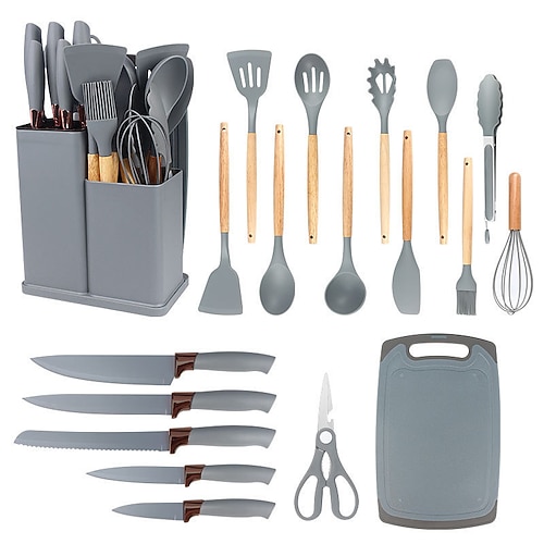 un set di pentole e coltelli da cucina da 19 pezzi con mattoncini, tra cui un set di pentole in silicone da 11 pezzi, 5 coltelli da chef affilati in acciaio inossidabile, pinze per mescolare e un