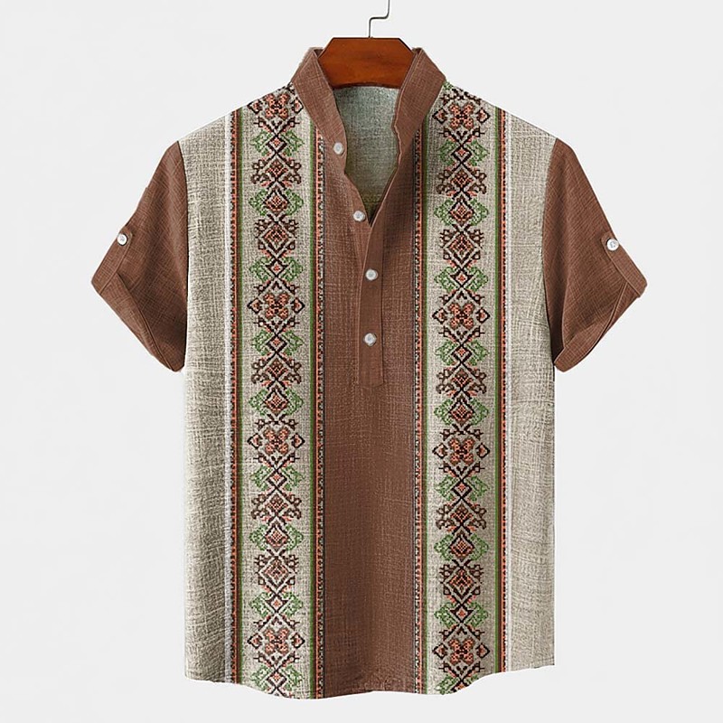 Men's Boardmasters Geometric Pattern Tribal Shirt Button Down Shirt Short Sleeve Vintage Retro Holiday Casual Daily Summer Spring Standing Collar Henley Collar 3D Print Linen Like Shirt Brown Green
