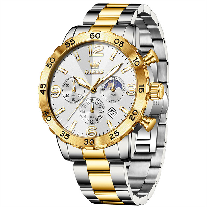 The New Olevs Men'S Steel Band Business Watch Moon Phase Luminous Calendar Chronograph 24-Hour Indication Quartz Watch Is A Fashionable Casual And Versatile Waterproof Sports Wristwatch