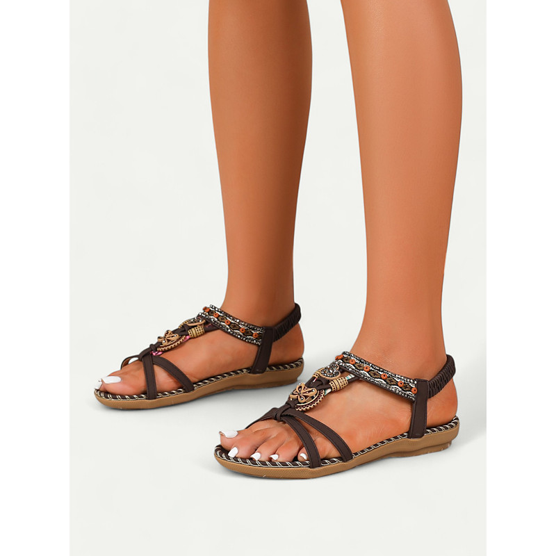 Women's Bohemian Style Flat Sandals with Beaded Embellishments and Elastic Strap, Comfortable Summer Shoes for Beach and Casual Outings
