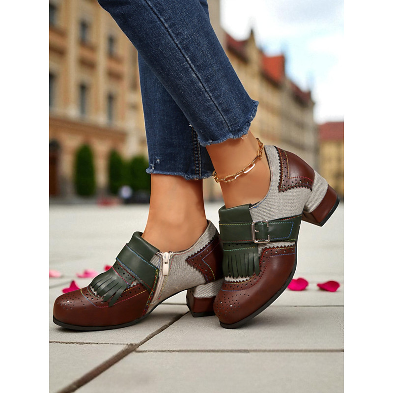 Women's 1950s Retro T-Strap Block Heel Oxfords with Fringe, Unique Color Block Design for Casual, Daily Street Style.