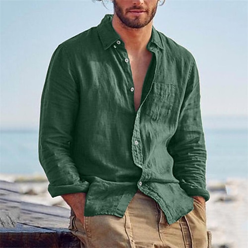 Herren Hemd Leinenhemd Sommerhemd Strandhemd Hemden zum Herausstecken Einfarbig Outdoor Urlaub Schwarz Braun Grün Khaki Langarm Umlegekragen Frühling Herbst Bekleidung Button-Down