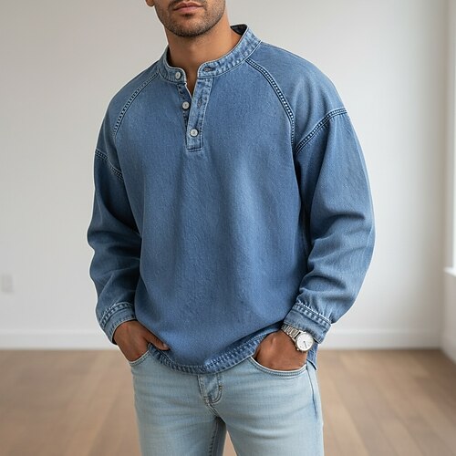 Per uomo Maglietta Maglia Henley Camicia di Jeans Camicia 100% cotone lavaggio acido Manica Lunga Semplice Vintage Streetwear Casual Lavato Manica corta Collo alla coreana Henley Casuale Streetwear